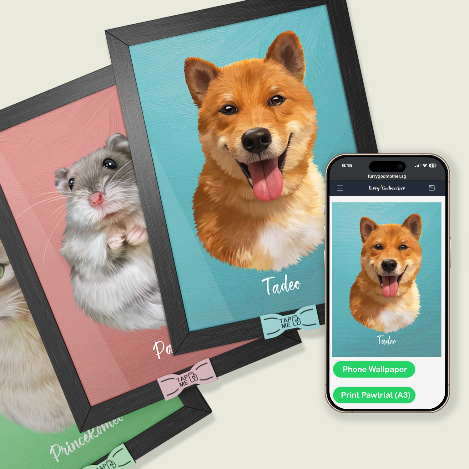 Our Pawtraits have built-in NFC chip! Simply tap your phone to bring your furkid's pawtrait to life with a touch of wonder. Plus, you can download as wallpapers, share with loved ones, or reprint it.